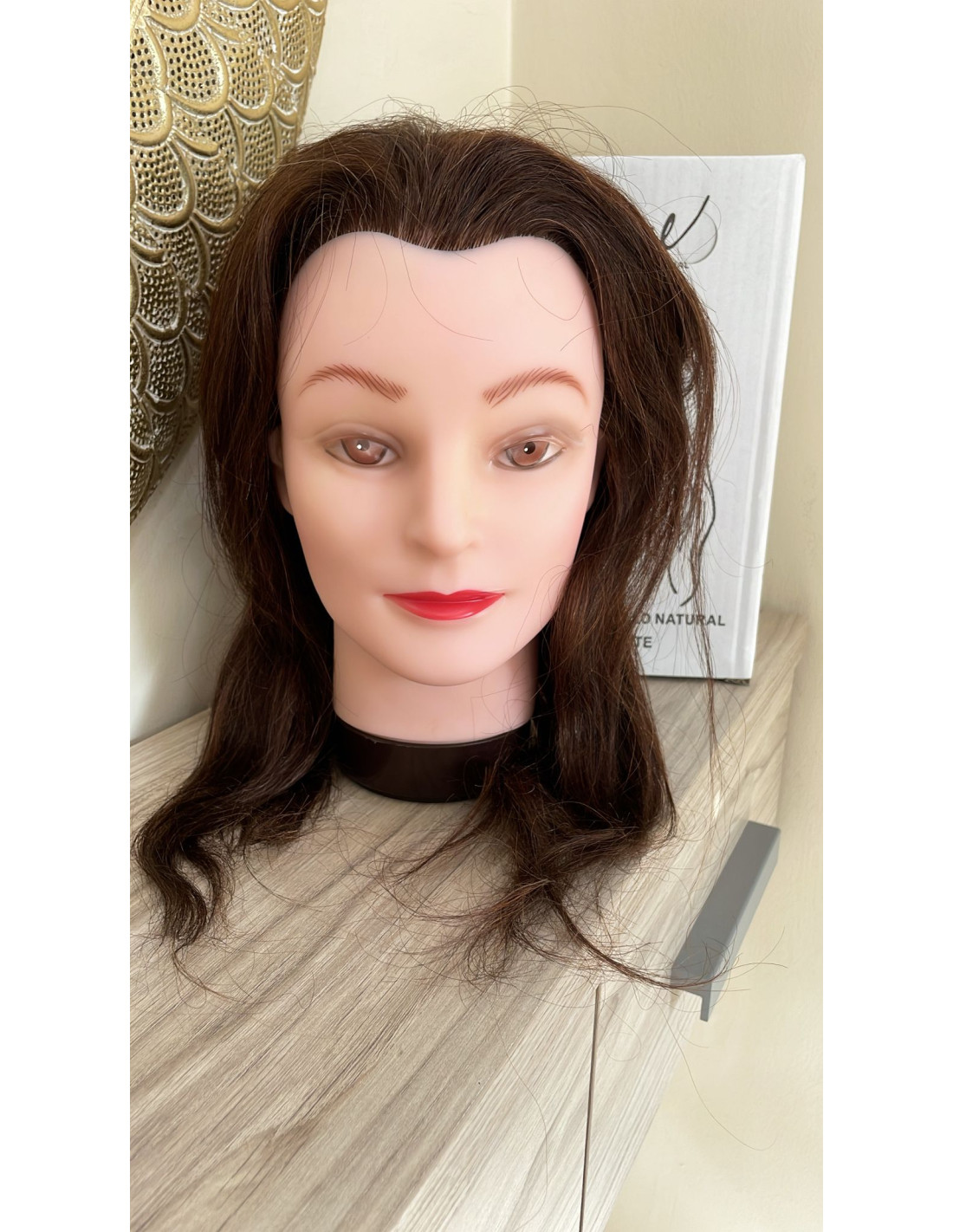 Cabeza Maniquí de Formación Eurostil con cabello castaño 100% natural, de 35-40 cm. Ideal para cortes, peinados, tintura, y permanentes. Soporta hasta 180ºC. Perfecta para estilistas que buscan perfeccionar sus técnicas.