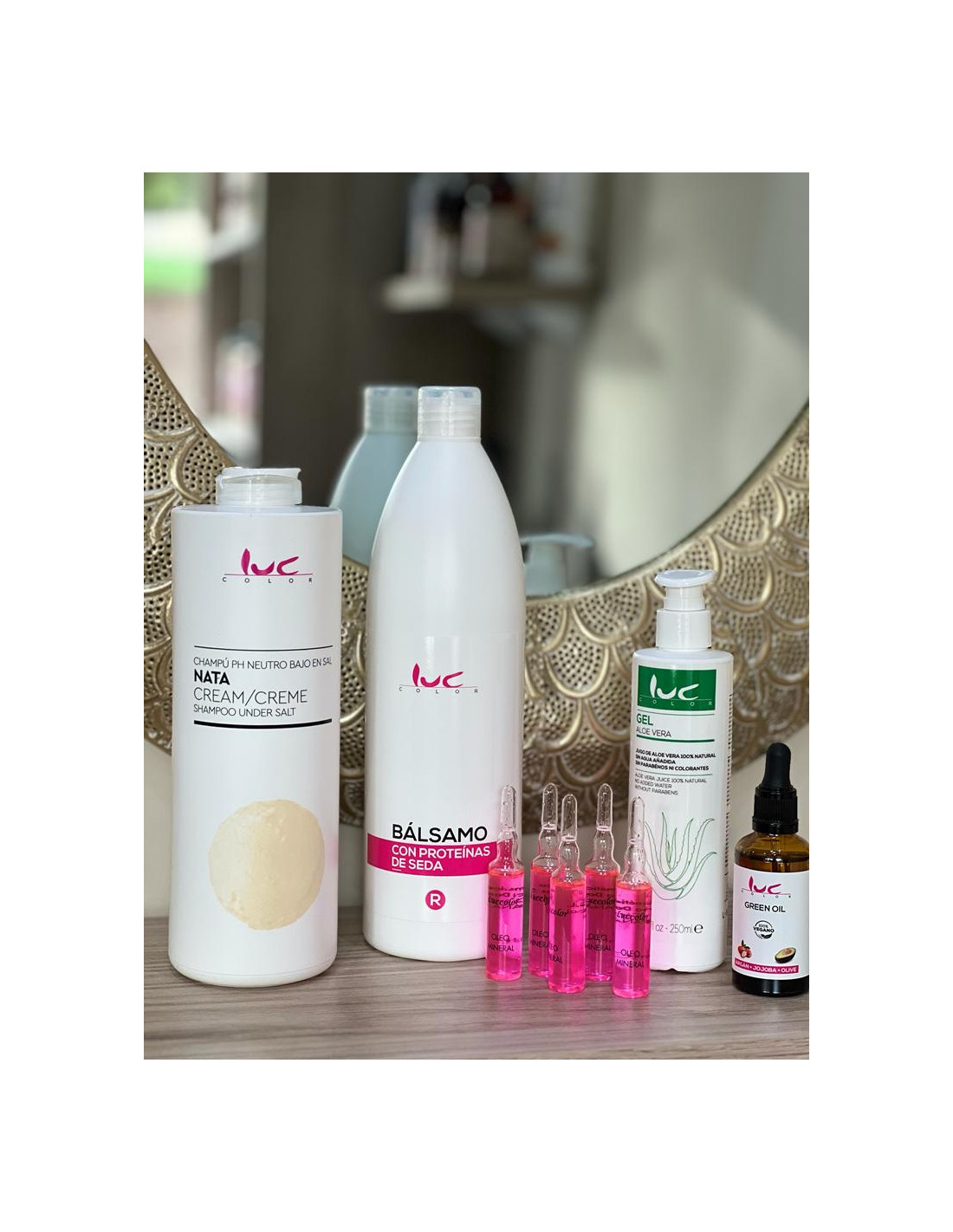 El Bálsamo Capilar 1000cc LUC Color es un producto diseñado para revitalizar y desenredar cabellos resecos, teñidos, permanentados y decolorados. Su fórmula avanzada reestructura la fibra capilar inmediatamente, dejando el cabello suave y radiante. Para usarlo, se aplica después del lavado, se masajea suavemente y se deja actuar durante dos o tres minutos antes de enjuagar abundantemente. Este bálsamo se presenta en una botella conveniente de 1 litro y ofrece un cuidado profundo y efectivo para el cabello.