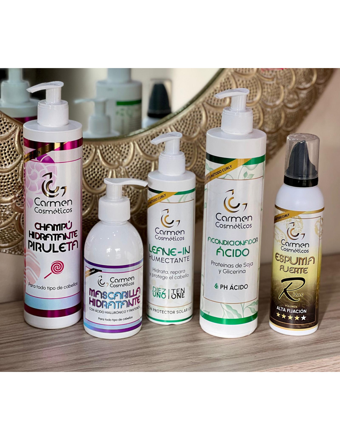 - Espuma Fuerte Rizos Carmen Cosméticos 200 ml o Gel Definidor Alta fijación Carmen Cosméticos: Productos opcionales para definir y fijar tus ondas o rizos, aportando volumen, suavidad y control del frizz según tus necesidades.